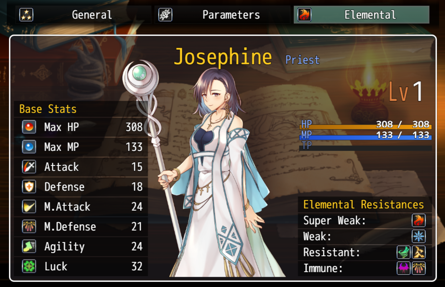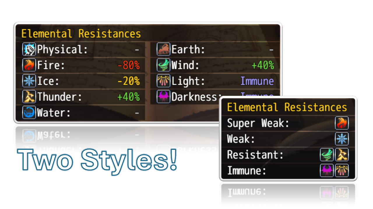 Despite its relevance in a majority of JRPGs, RPG Maker's default status scene doesn't display elemental resistances in an intuitive way - now it does!